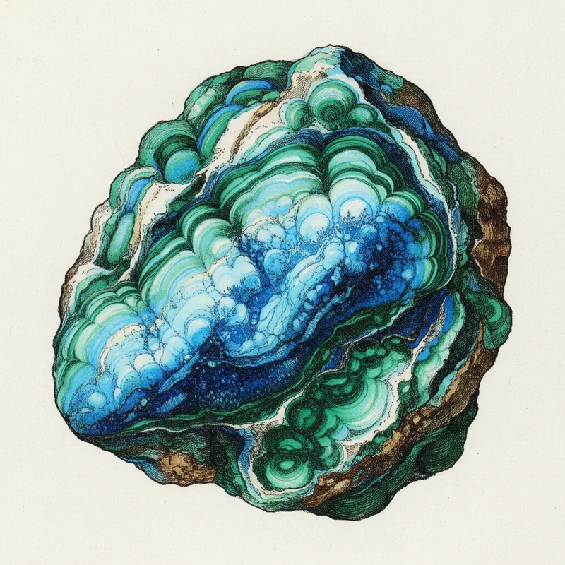 The distinctive banded blue-green appearance reflects this mixed secondary mineralogy. Bright green bands are malachite (copper carbonate), deeper blue zones are azurite, softer blue-green matrix is chrysocolla (copper silicate), and pale sky-blue nodes may be turquoise where phosphate-rich fluids were present. The proportions vary stone to stone, which is why no two Eilat Stone cabochons look alike.