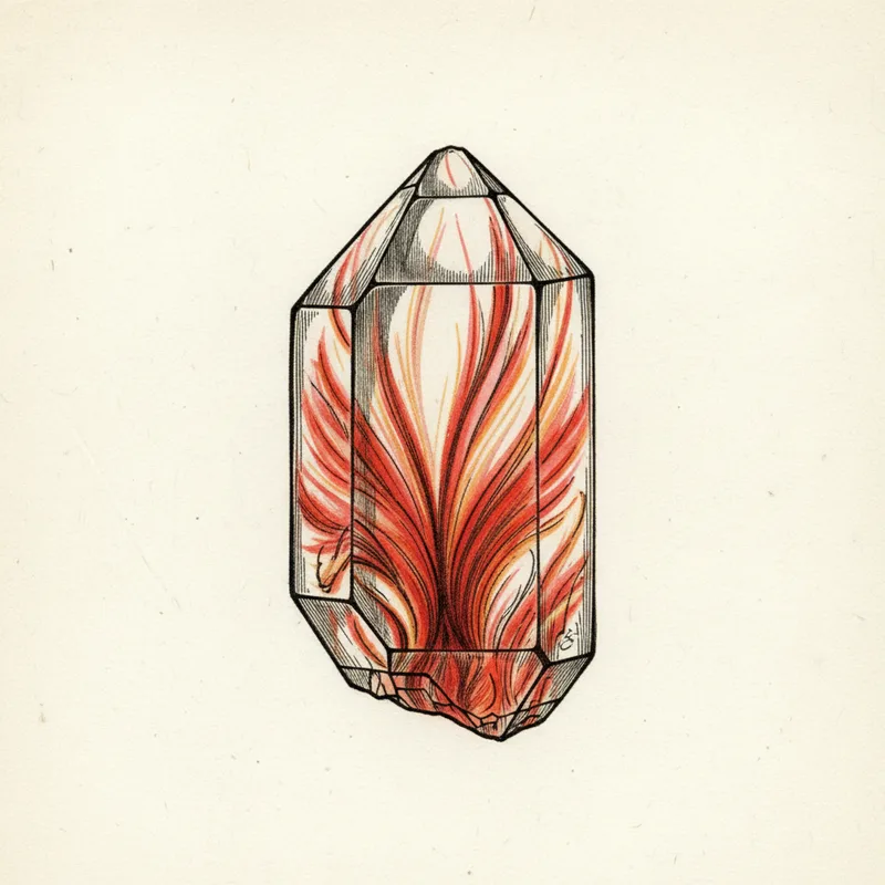 The dramatic flame, starburst, and cloud patterns are a record of growth dynamics. Hematite (Fe₂O₃) gives the vivid red and the metallic flecks, while limonite and goethite (both FeO(OH)) produce the softer orange, yellow, and rust tones. When inclusions settled slowly in a still growth environment they formed clouds. When quartz grew quickly across a hematite plate, the fragments were fanned out into radiating flame shapes. The starburst pattern prized in Madagascar harlequin quartz forms when a single hematite crystal was shattered and its pieces swept outward along the quartz growth front.
